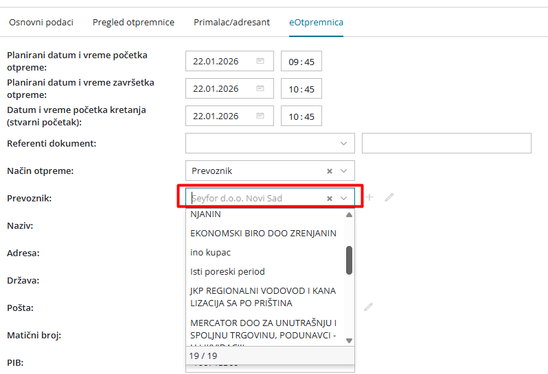 Kad na eOtpremnici izaberemo opciju Prevoznik, otvara nam se šifarnik stranaka iz kog možemo izabrati stranku iz Šifarnika stranaka: