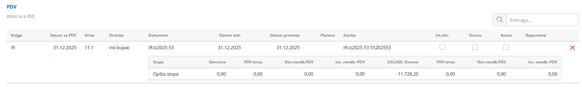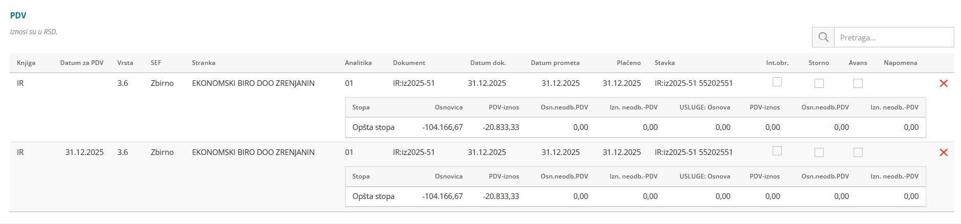 Prvi red bez datuma sa PDV-om je red u obračunu PDV-a za osnovicu, drugi red sa datumom potvrde je red koji prikazuje PDV u obračunu PDV-a.