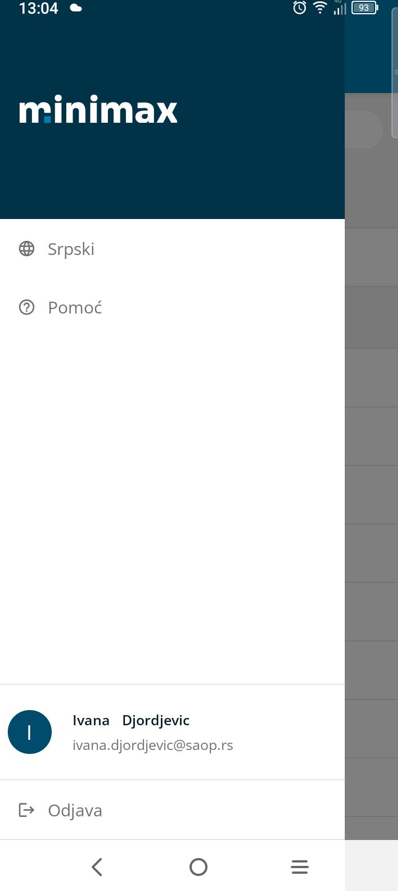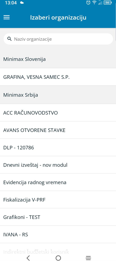 Nakon što smo se prijavili u Minimax mobilnu aplikaciju sa korisničkim imenom i lozinkom koju i inače koristimo za pristup Minimax-u, dobijamo sledeći pregled svih naših organizacija: