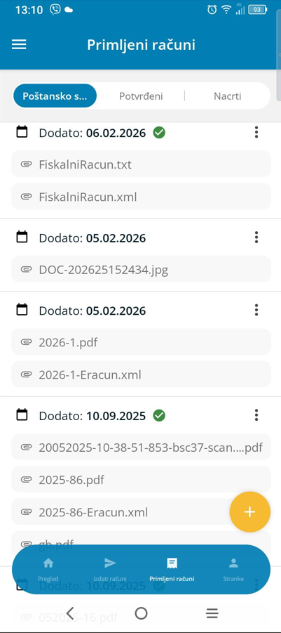 U donjem desnom uglu na plusić možemo dodati novu fakturu u poštansko sanduče tako što ćemo je direktno iz aplikacije slikati (nova slika) ili tako što ćemo je samo priložiti iz telefona (izaberi sliku), uvesti PDF kao prilog ili očitati QR kod sa fikslanog računa:
