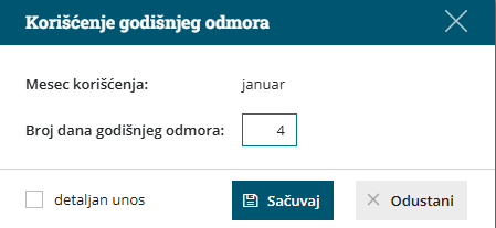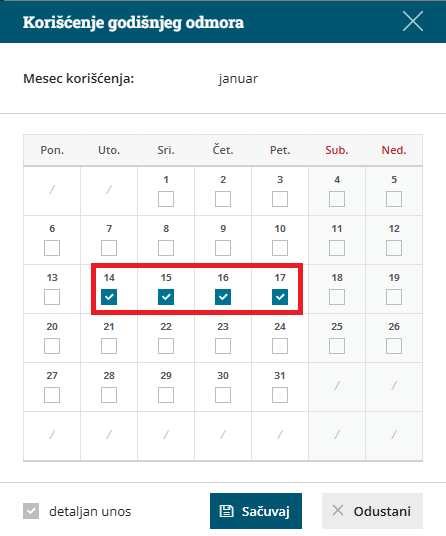 Takođe možete da unesete i dataljniji pregled za dane kada je radnik bio na godišnjem odmoru čekiranjem opcije detaljan unos gde dobijate pregled dana u mesecu. Unesite dane godišnjeg odmora koje je radnik koristio godišnji odmor i Sačuvajte.