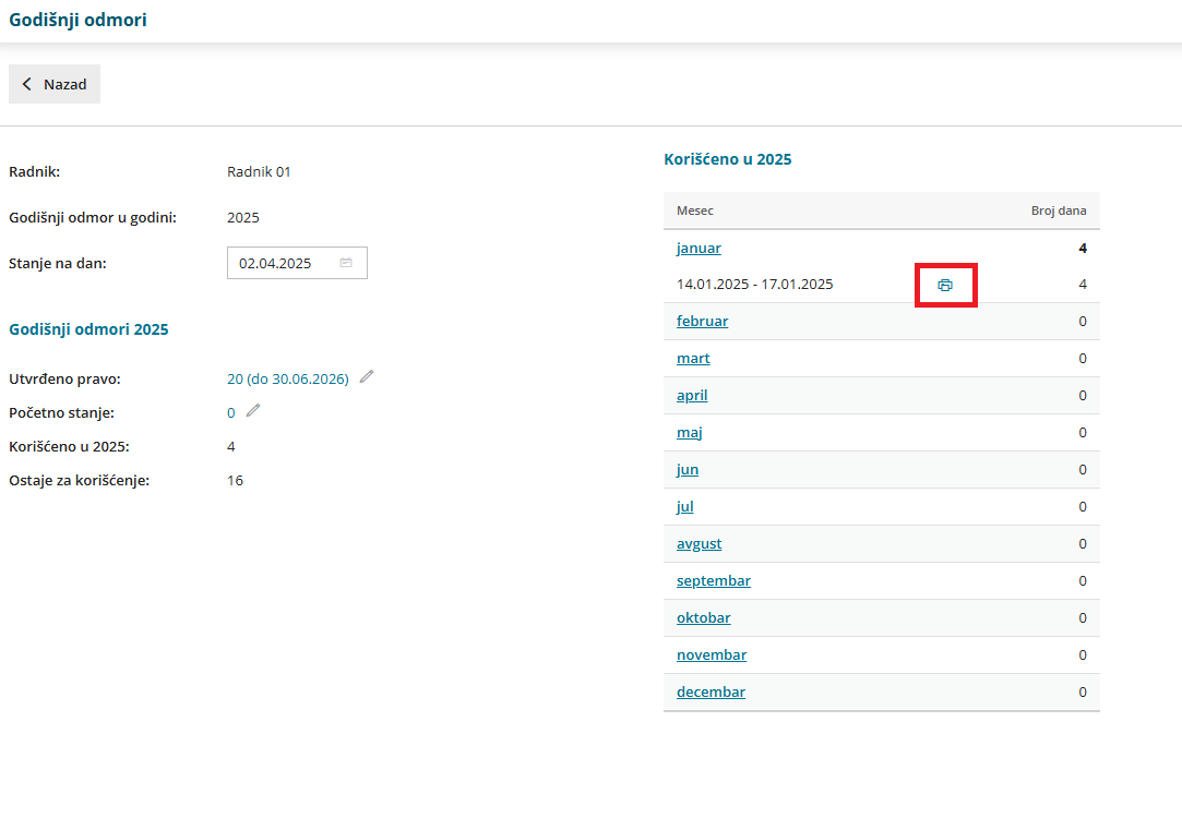 Po osnovu unetih podataka za taj mesec dobijate pregled od kog do kog perioda je radnik koristio odmor kao i opciju štampanja rešenja o godišnjem odmoru. Klikom na opciju štampača dobijate mogućnost štampe rešenja.