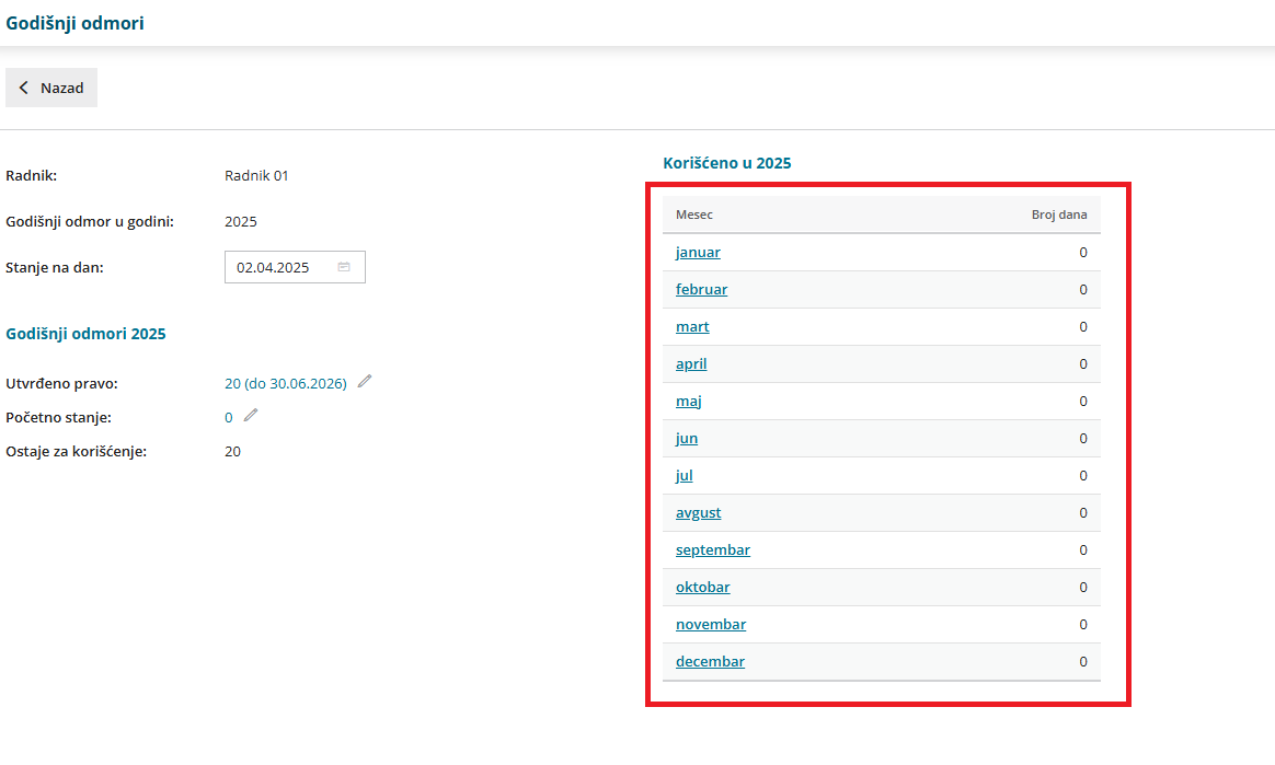 U delu korišćeno unosite broj dana u određenom mesecu kada je radnik koristio godišnji odmor.