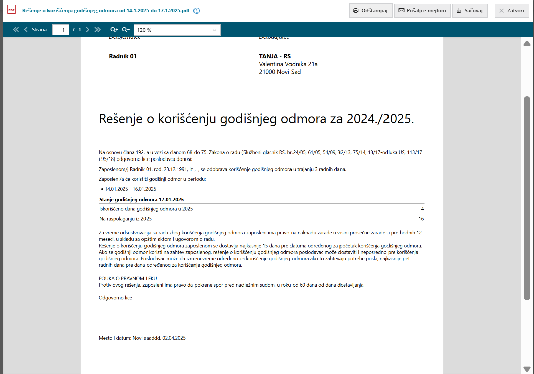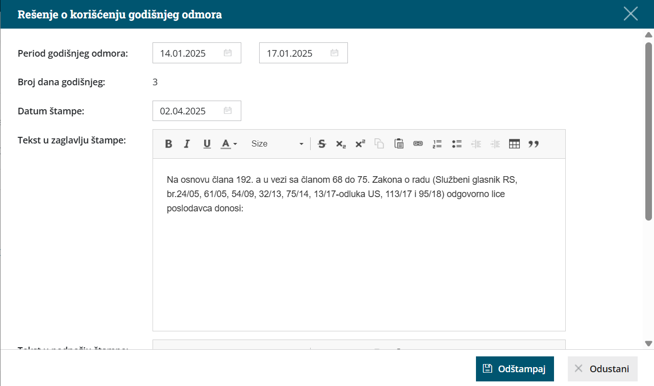 Na sledećem koraku dobijamo mogućnost uređivanja same štampe rešenja o godišnjem odmoru odnosno uređivanja zaglavlja i podnožja samog dokumenta kao i teksta koji je potrebno da imate iskazano na rešenju. Klikom na opciju odštampaj dobijate rešenje o godišnjem odmoru u PDF formatu koje možete da sačuvate ili pošaljete iz programa.