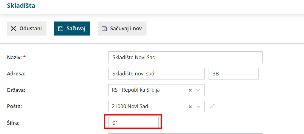 Šifru objekta za adresu otpreme program popunjava u xml-u eOtpremnice ukoliko je uneta šifra skladišta :