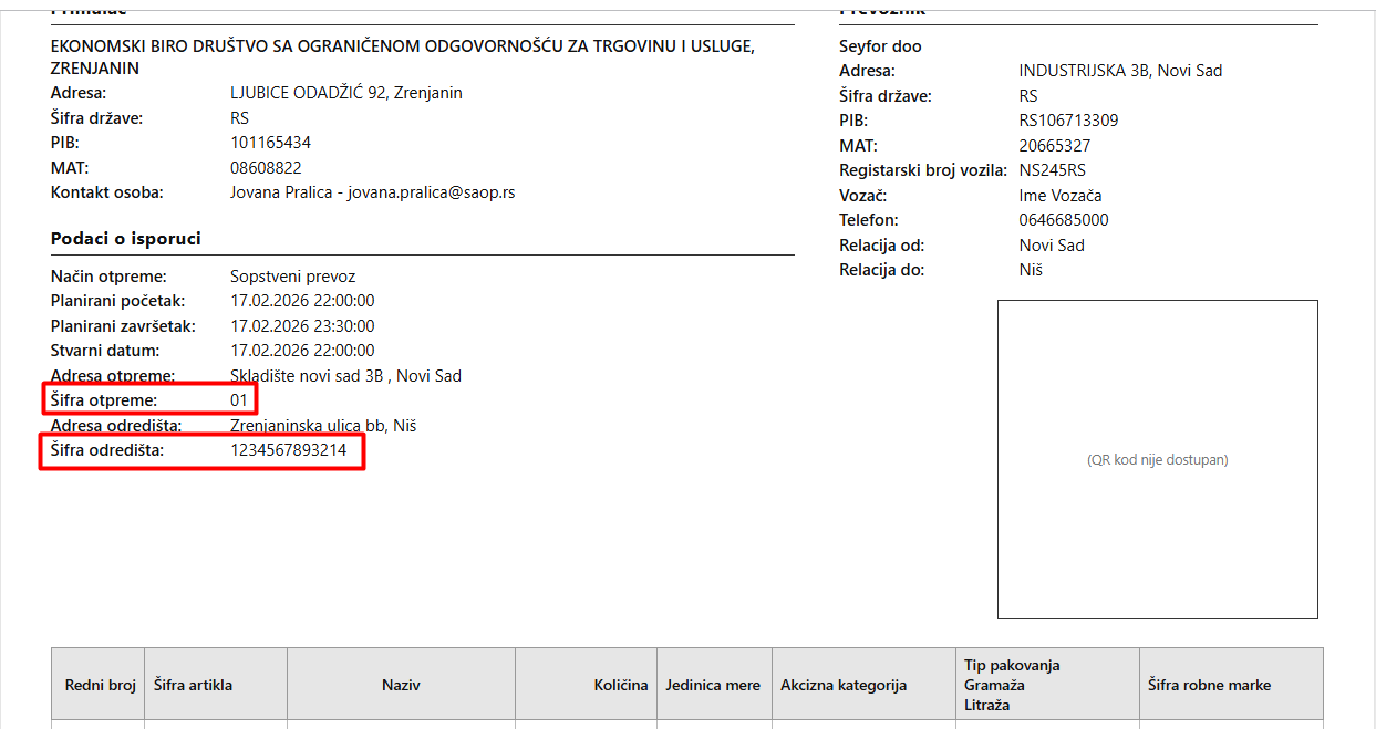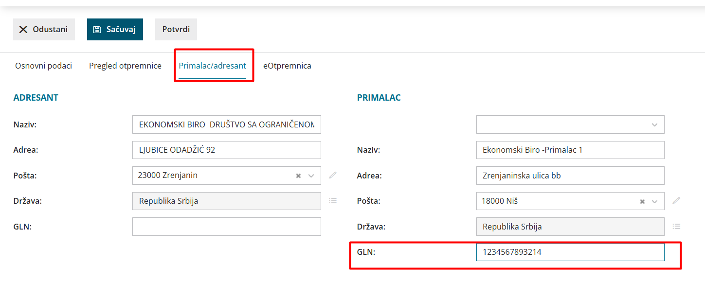 Ukoliko je potrebno uneti šifru objekta za Adresu odredišta taj podatak unosite na samoj eOtpremnici u delu Primalac unosom u polje GLN broj: