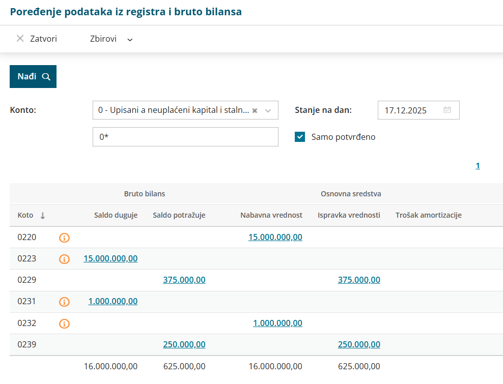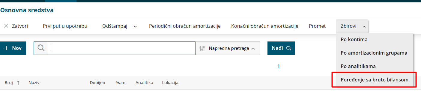 Kroz Knjigovodstvo>Osnovna sredstva>Zbirovi>Poređenje sa bruto bilansom:
